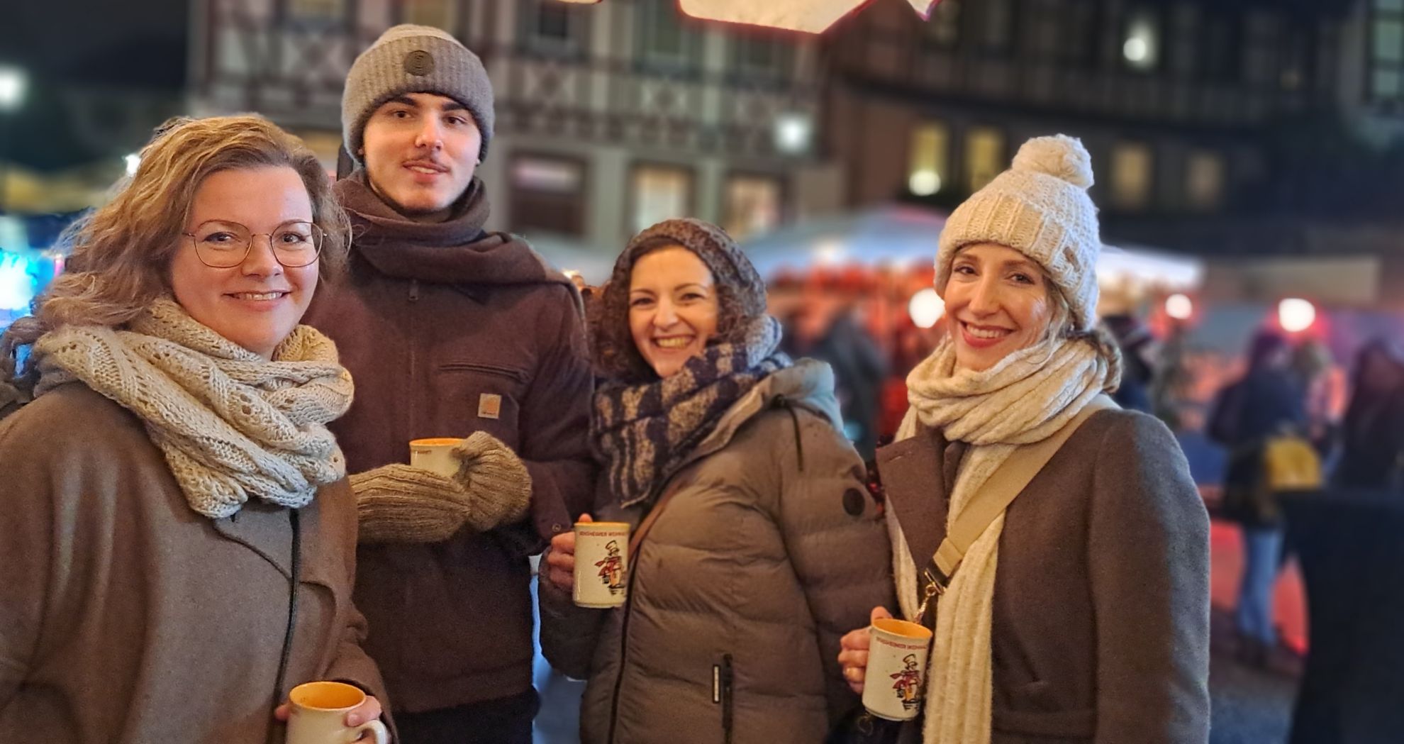 Der Abend begann auf dem Bensheimer Marktplatz in entspannter Atmosphäre. Bei dampfendem Winzerglühwein, aromatischem Punsch und anderen köstlichen Heißgetränken war die Stimmung von Anfang an harmonisch und gesellig. Der Duft von Gewürzen und das warme Licht der Laternen schufen eine perfekte Einstimmung auf den Abend.